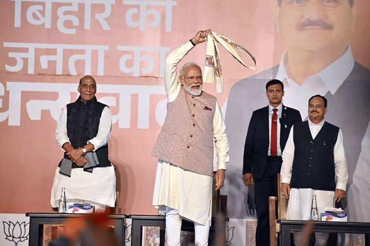 ବିହାରରେ ଏନଡିଏର ବିଜୟ ପରେ ପ୍ରଧାନମନ୍ତ୍ରୀ ନରେନ୍ଦ୍ର ମୋଦୀ ଗାମୁଛା ଉଡ଼ାଇ ଉତ୍ସବ ମନାଇଛନ୍ତି। ଦିଲ୍ଲୀ ବିଜେପି କାର୍ଯ୍ୟାଳୟରେ ଶୁକ୍ରବାର ସନ୍ଧ୍ୟାରେ ଏହି ଦୃଶ୍ୟ ଦେଖିବାକୁ ମିଳିଥିଲା। କାର୍ଯ୍ୟାଳୟରେ ମୋଦୀ ପହଞ୍ଚିବା ପରେ ଏକ ଧଳା ଗାମୁଛାକୁ ବାମ ହାତରେ ଧରି ଉଡ଼ାଇଥିଲେ। ଏହା ପରେ ପ୍ରଧାନମନ୍ତ୍ରୀଙ୍କୁ ବିଜେପି ରାଷ୍ଟ୍ରୀୟ ଅଧ୍ୟକ୍ଷ ଜେ.ପି. ନଡ୍ଡା, ପ୍ରତିରକ୍ଷା ମନ୍ତ୍ରୀ ରାଜନାଥ ସିଂହ ଏବଂ ସ୍ଵରାଷ୍ଟ୍ର ମନ୍ତ୍ରୀ ଅମିତ ଶାହ ଏକ ମାଖନା ମାଳ ପିନ୍ଧାଇ ଭବ୍ୟ ସମ୍ବର୍ଦ୍ଧନା ଦେଇଥିଲେ।
