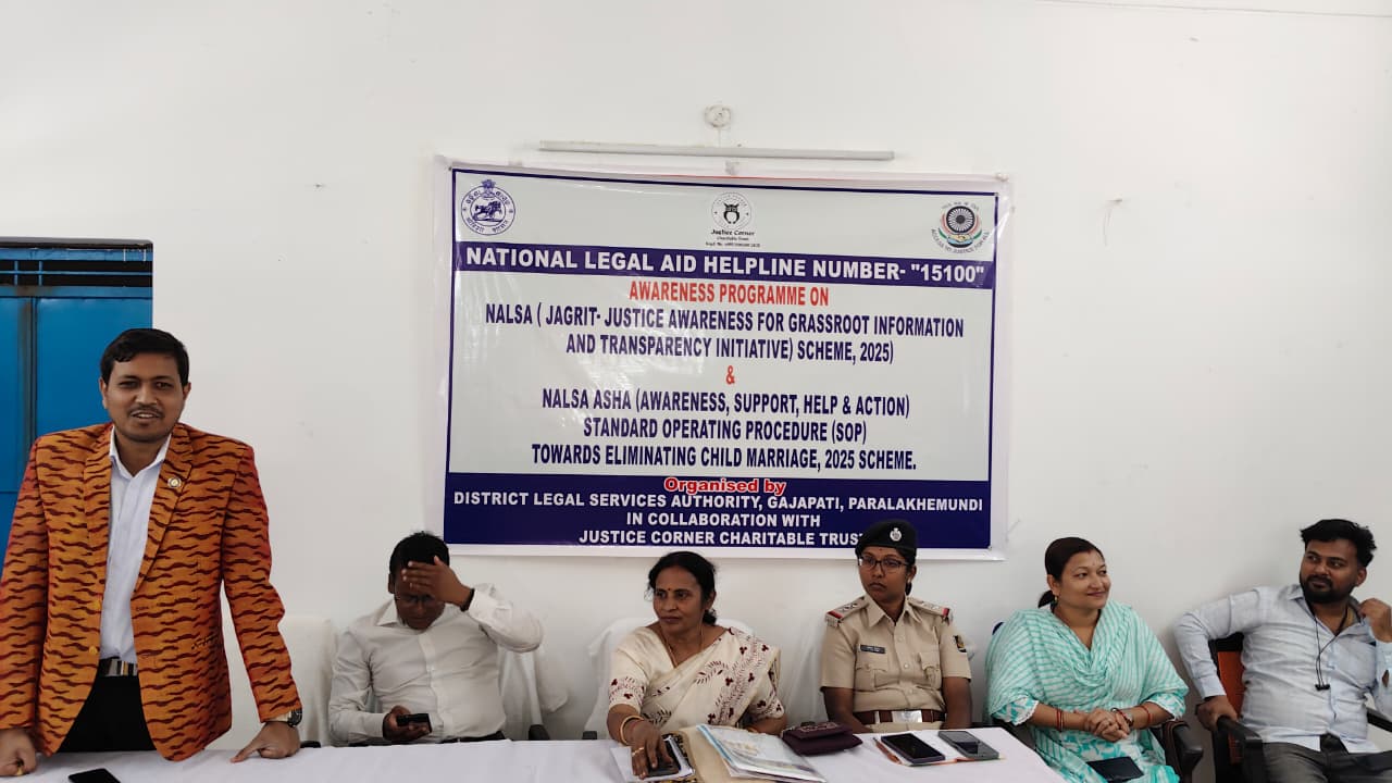 ପାରଳାଖେମୁଣ୍ଡି: ନାଲସା ଜାଗୃତି ଯୋଜନା ଏବଂ ନାଲସା ଆଶା ଯୋଜନା ଅନୁଯାୟୀ ବାଲ୍ୟ ବିବାହ ନିରୋଧ ପାଇଁ ଆଇନରେ ରହିଥିବା ବିଭିନ୍ନ ଦିଗ ବିଷୟରେ ଏକ ଜନ ସଚେତନତା କାର୍ଯ୍ୟକ୍ରମ ଆଜି ତା ୦୭.୦୨.୨୦୨୬ରିଖ ସକାଳ ୧୦:୩୦ ଘଟିକା ସମୟରେ ଗଜପତି ଜିଲ୍ଲା ଅନ୍ତର୍ଗତ ଗୋସାଣି ବ୍ଲକର ଲାବଣ୍ୟଗଡ଼ ଗ୍ରାମ ପଞ୍ଚାୟତ ସମ୍ମିଳନୀ ହଲରେ ଗଜପତି ଜିଲ୍ଲା ଆଇନ ସେବା ପ୍ରାଧିକରଣ ସଚିବ ବିମଳ ରାଉଳଙ୍କ ଅଧ୍ୟକ୍ଷତାରେ ତଥା ପାରଳାଖେମୁଣ୍ଡିସ୍ଥିତ ଅଗ୍ରଣୀ ସ୍ବେଚ୍ଛାସେବୀ ସଙ୍ଗଠନ ଜଷ୍ଟିସ କର୍ଣ୍ଣର ଚାରିଟେବଲ ଟ୍ରଷ୍ଟଙ୍କ ସହଯୋଗରେ